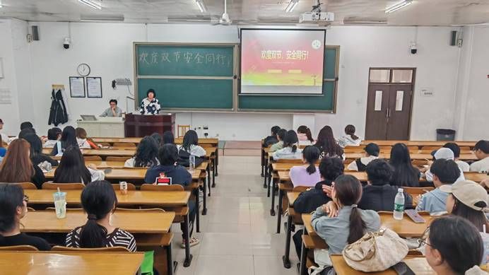 9月29日,外国语学院以“欢度双节,安全同行”为主题召开假期安全教育大会,学院书记刘叶青主讲,大一至大四全体学生线下参会。